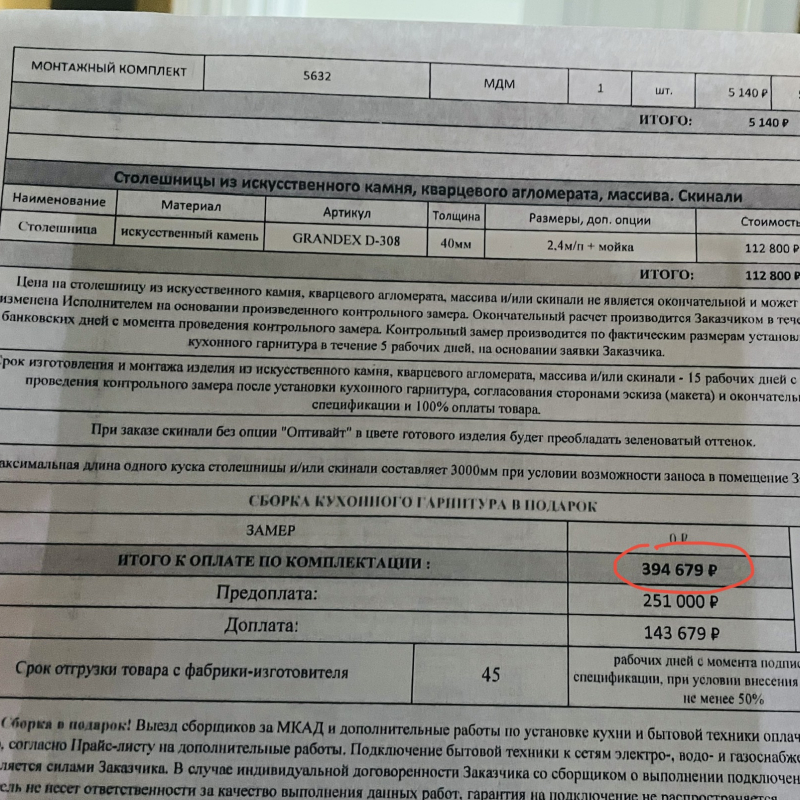 1. Сначала вы оплачиваете 70% от заказа. Сроки нарушаются. Кухня доставляется на 1.5 месяца позже заявленного срока. Затем ДО дня доставки вас обязывают оплачивать остаток суммы до 100%…. То есть вы оплачиваете полную стоимость, не видя кухни и не зная, в каком виде, качестве и составе (кучи деталей из заказа просто не будет в комплекте) вы не получите. Это сделано намерено, потому что, если клиент увидит, что кухня сделана с нарушением замеров и с отсутствием деталей, заставить вас оплатить полную стоимость будет невозможно. Это низко и подло со стороны компании. Серьёзная компания, уверенная в качестве своего товара, не выберет для себя такую тактику.
